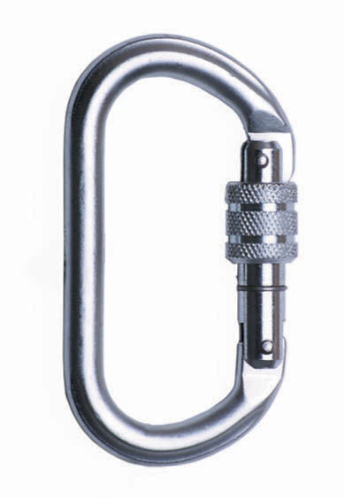 Ocelová oválná karabina se šroubovací pojistkou a pevností 20 kN, možnost otevření 18 mm, splňuje normu EN 362.