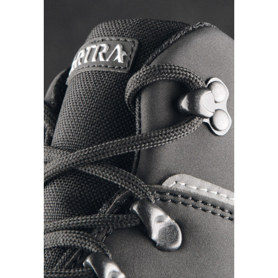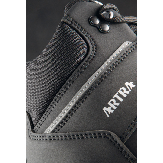 Lehká, bezpečnostní, uzavřená kotníková obuv, se zpevněnou špicí a planžetou proti průcpichu, s hydrofóbní povrchovou úpravou proti vodě. Tato obuv vyniká svou extra lehkostí a prodyšností, kterou jí zajišťuje hydrofóbní mikrovlákno VELOUR PRO 2,2mm. Vhodné všestranné použití při práci jak v letních nebo zimních dnech nebo jako celoroční obuv v exteriéru i interiéru. Bezpečnostní pracovní obuv zn. ARTRA má protiskluzovou podrážku (SRC), antistatickou podrážku a také podrážku odolnou proti pohonným látkám, ESD ochranu a také bezpečnostní ocelovou tužinku a nekovou planžetu proti průpichu.