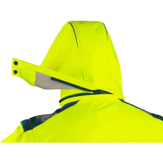 Pánská výstražná softshellová bunda s odepínací kapucí a rukávy, odolná proti vodě a větru. Fleecový límec, regulovatelné manžety na rukávech, vnitřní elastické manžety s otvorem na prst, náprsní a boční kapsy na zip, v pravé náprsní kapse odnímatelné pouzdro na ID kartu, segmentované reflexní pásky, kontrastní HV červené a petrolejové doplňky, vnitřní náprsní kapsa, stahování v dolním okraji, TPU membrána, odolnost materiálu proti průniku vody 8000 mm mimo oblast švů, paropropustnost 3000 g/m2/24h.