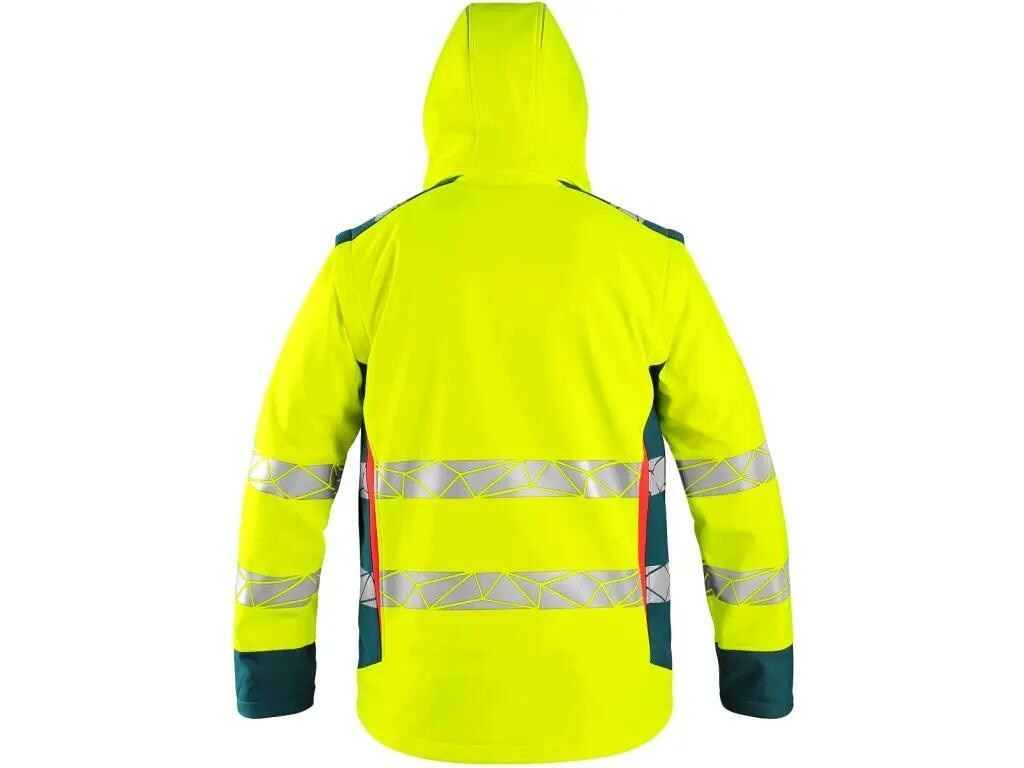 Pánská výstražná softshellová bunda s odepínací kapucí a rukávy, odolná proti vodě a větru. Fleecový límec, regulovatelné manžety na rukávech, vnitřní elastické manžety s otvorem na prst, náprsní a boční kapsy na zip, v pravé náprsní kapse odnímatelné pouzdro na ID kartu, segmentované reflexní pásky, kontrastní HV červené a petrolejové doplňky, vnitřní náprsní kapsa, stahování v dolním okraji, TPU membrána, odolnost materiálu proti průniku vody 8000 mm mimo oblast švů, paropropustnost 3000 g/m2/24h.