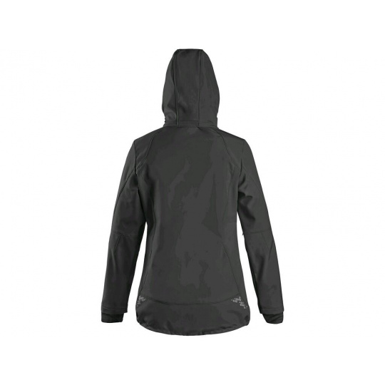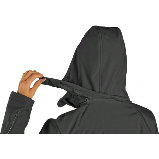 Dámská softshellová bunda s odepínací kapucí, odolná proti vodě a větru, zapínaní na zip, větrání v podpaží, náprsní kapsa na zip, boční kapsy na zip, rukávy s vnitřními manžetami, stahování v dolním okraji, reflexní doplňky, TPU membrána. Odolnost materiálu proti průniku vody 5 000 mm mimo oblast švů, paropropustnost 5 000 g/m2/24h.