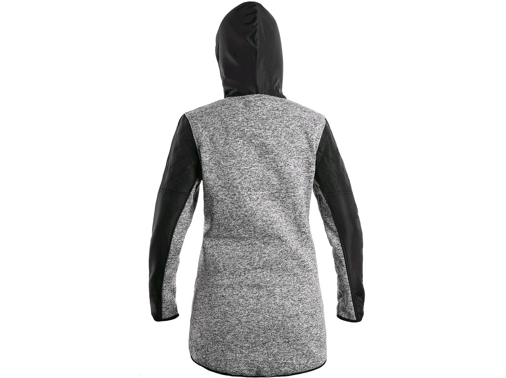 Dámská bunda CAPE, šedá: Dámská bunda z pleteniny, prodloužená, kombinace materiálů, kapuce napevno, zapínaní na zip, rukávy zakončeny gumičkou, 2 boční kapsy.