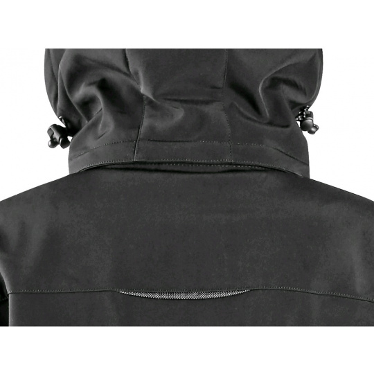 Dámský softshellový kabát s odepínací kapucí, odolný proti vodě a větru, zapínaní na zip, rukávy s vnitřními manžetami, stahování v dolním okraji, spodní kapsy na zip, relfexní doplňky, TPU membrána, odolnost materiálu proti průniku vody 10 000 mm mimo oblast švů, paropropustnost 3 000 g/m2 /24h.