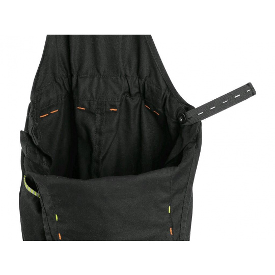 Dětské kalhoty s náprsenkou, náprsní kapsa na zip s menšími kapsičkami, pas s poutky na opasek, boční zapínání na knoflíky, v zadní části guma s knoflíkem pro přizpůsobení velikosti, přední klínové kapsy, kapsy na tužky a drobné předměty na levém stehni, zipová kapsa na pravém stehni, zadní jednoduchá kapsa, šle vzadu do gumy, reflexní doplňky.