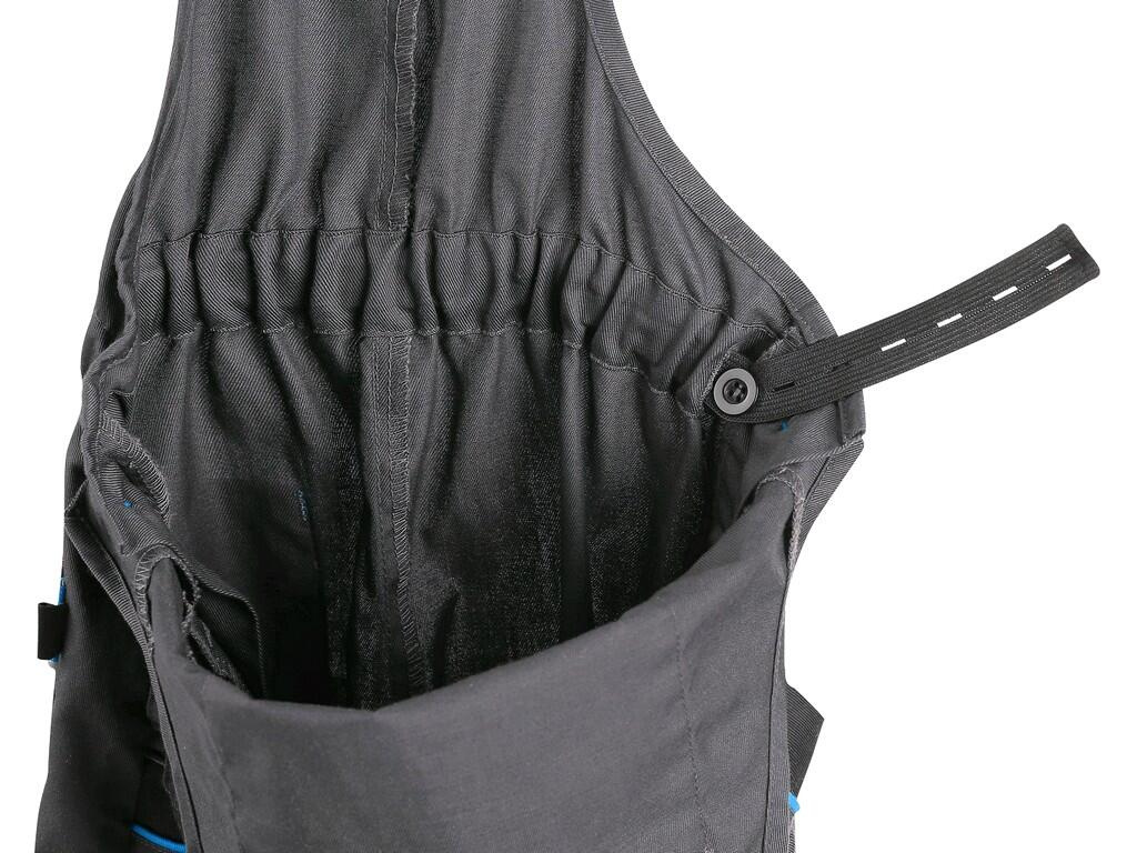 Pracovní kalhoty PHOENIX CRONOS s laclem, šedo-modré: Pánské kalhoty s náprsenkou, přední klínové kapsy, kapsa na metr, boční kapsa s klopou, zadní jednoduchá kapsa, pas s poutky na opasek, kapsa na náprsence.