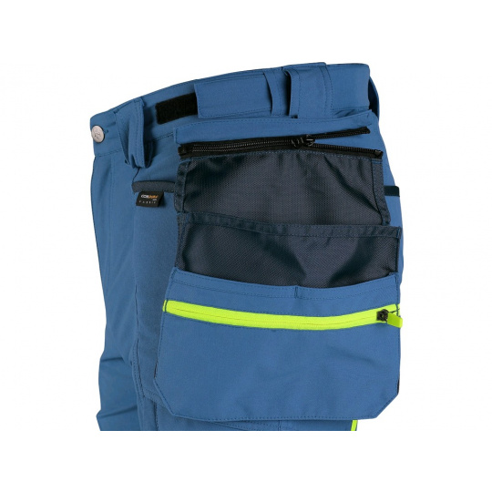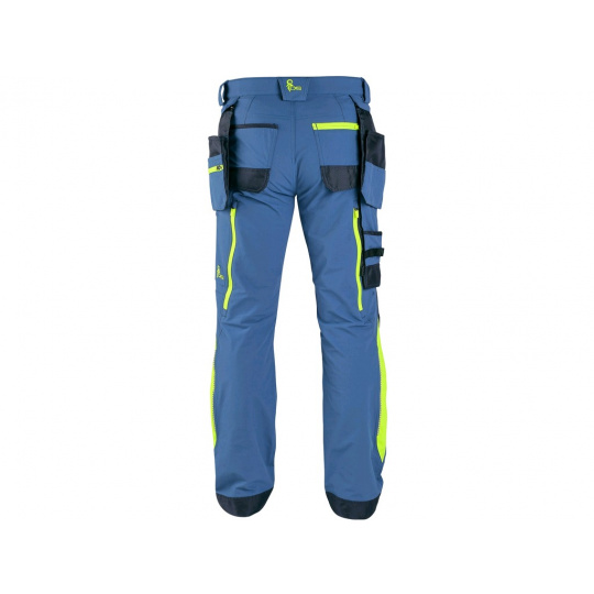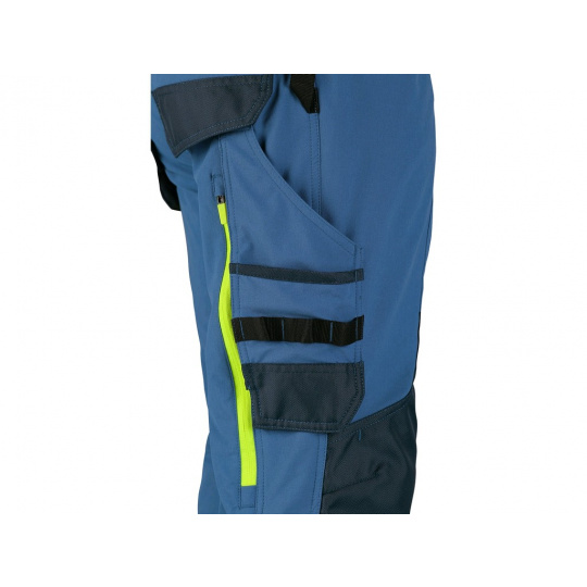 Pánské montérkové kalhoty s kontrastními barevnými a reflexními doplňky. Konstrukce 4-way stretch umožňuje roztahování materiálu ve všech čtyřech směrech a tím i snadný a volný pohyb. Vysoké procento nylonu zaručuje schopnost rychlého schnutí. Vybavení kalhot: flexibilní pas s možností upravení velikosti a poutky na opasek, 2 přední kapsy, 2 odnímatelné kapsy na nářadí vyztuženy materiálem CORDURA, kapsa na zip na stehně, multifunkční boční kapsa, 2 zadní kapsy ve spodní části vyztuženy materiálem CORDURA, zipová ventilace v zadní části stehen, kolena zesílena materiálem CORDURA s možností vložení kolenních výztuh, spodní část nohavic vyztužena materiálem CORDURA.
