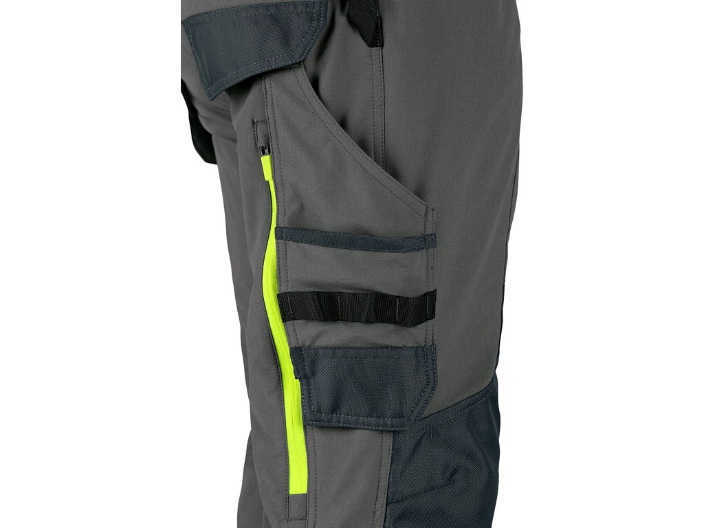 Pánské montérkové kalhoty s kontrastními barevnými a reflexními doplňky. Konstrukce 4-way stretch umožňuje roztahování materiálu ve všech čtyřech směrech a tím i snadný a volný pohyb. Vysoké procento nylonu zaručuje schopnost rychlého schnutí. Vybavení kalhot: flexibilní pas s možností upravení velikosti a poutky na opasek, 2 přední kapsy, 2 odnímatelné kapsy na nářadí vyztuženy materiálem CORDURA, kapsa na zip na stehně, multifunkční boční kapsa, 2 zadní kapsy ve spodní části vyztuženy materiálem CORDURA, zipová ventilace v zadní části stehen, kolena zesílena materiálem CORDURA s možností vložení kolenních výztuh, spodní část nohavic vyztužena materiálem CORDURA.