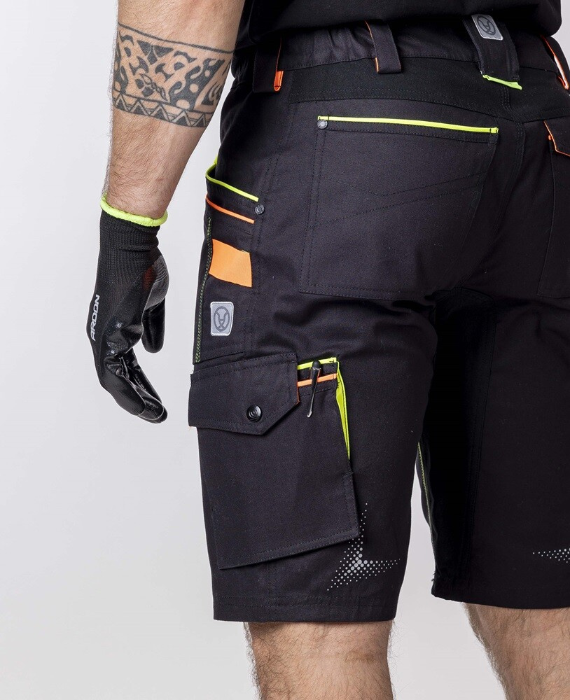 - kraťasy jsou vybaveny pružným pasovým límcem spolu se skrytým zadním dvojitým poutkem pro pohodlné usazení opasku, vnitřní protiskluzovou páskou, D kroužkem na karabinu, 2 průhmatovými kapsami, 1 přední zipovou kapsou, 1 přední nářaďovou kapsou se širokým poutkem