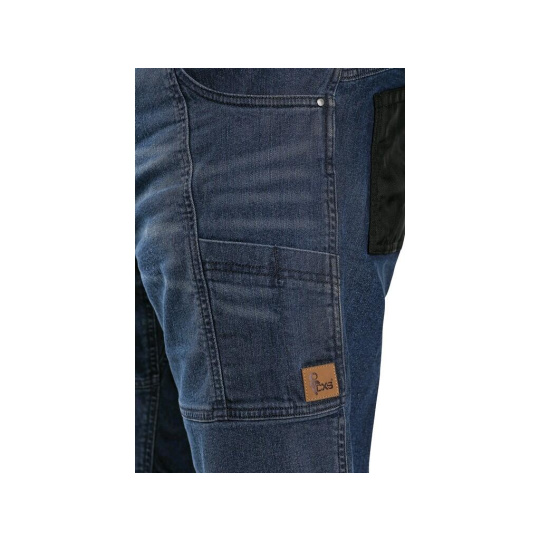 Pánské džínové kraťasy, pas s poutky na opasek a plastovým přívěskem, 2 přední kapsy, 2 zadní kapsy z materiálu CORDURA, boční multifunkční kapsy, na pravé kapse poutko pro kladivo.