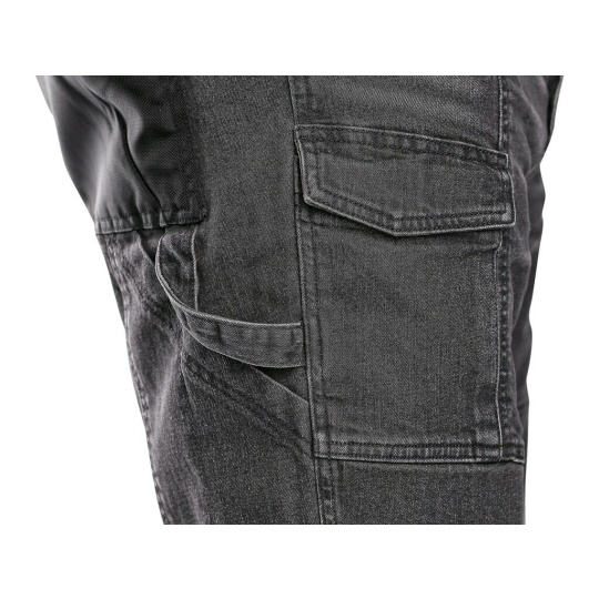 Pánské džínové kraťasy, pas s poutky na opasek a plastovým přívěskem, 2 přední kapsy, 2 zadní kapsy z materiálu CORDURA, boční multifunkční kapsy, na pravé kapse poutko pro kladivo.