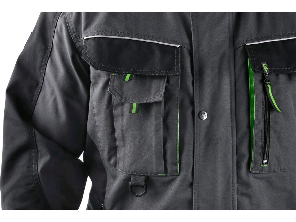 Pracovní bunda SIRIUS Lucius šedo-zelená: Pracovní pánská montérková bunda, rukávy do nastavitelné manžety, kryté zapínání na zip a na druky, multifunkční náprsní kapsy, boční kapsy na zip, materiál : canvas 65% polyester 35% bavlna 270g/m2, ramena vyztužena materiálem 600D polyester. Norma EN340. Zelené doplňky.