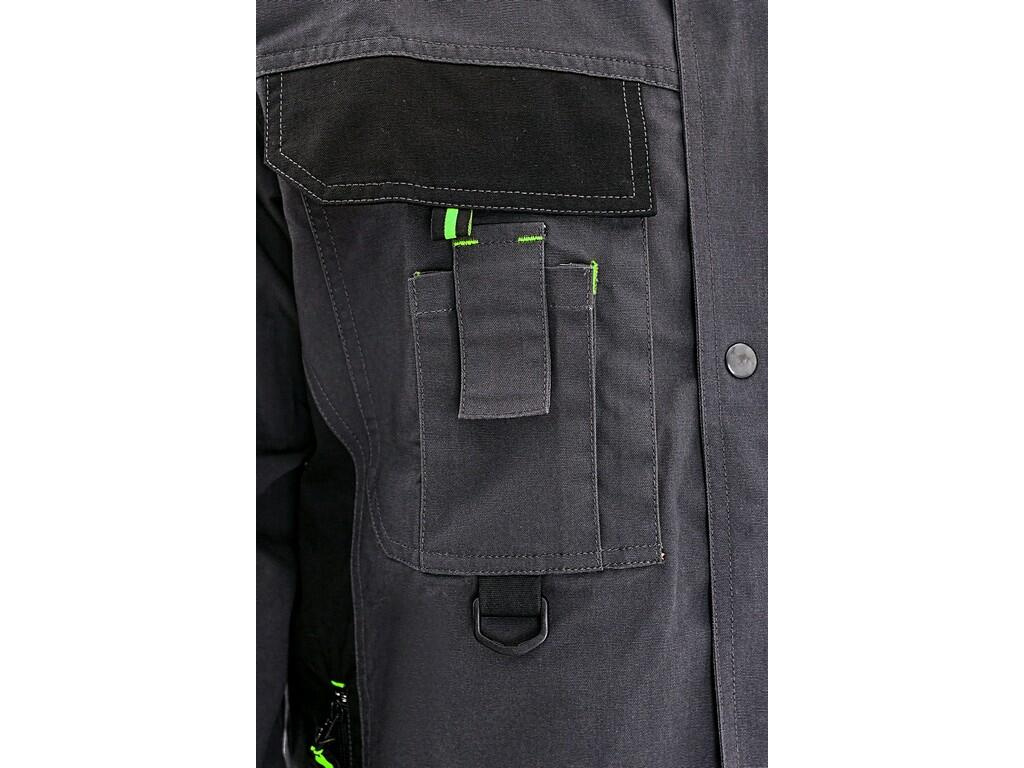 Pracovní bunda SIRIUS Lucias zimní: Pracovní pánská montérková bunda, vyteplená fleesem, rukávy do nastavitelné manžety, kryté zapínání na zip a na druky, multifunkční náprsní kapsy, boční kapsy na zip, materiál : canvas 65% polyester 35% bavlna 270g/m2, ramena vyztužena materiálem 600D polyester. Norma EN340. Zelené doplňky.