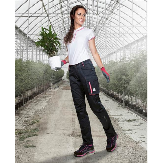 dámské pracovní kalhoty z kolekce FLORET ergonomický střih anatomicky tvarovaná kolena elastický materiál přední průhmatové kapsy, zadní kapsy kryté patkou, boční multifunkční zdvojená kapsa vyvýšený pásek na zadním díle reflexní prvky zdvojená záložka - možnost prodloužení délky nohavic materiál: 64% polyester, 33% bavlna, 3%