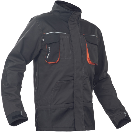 Pánská pracovní bunda, zapínání na zip s krytkou na suchý zip; Oxford 600D zesílené loketní díly; 2 boční kapsy, 2 náprsní kapsy; 1 e-secure kapsa na telefon; reflexní detaily; kontrastní barva bartacks.