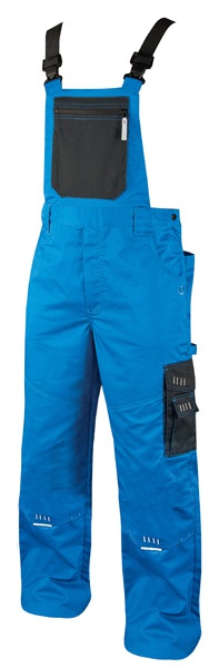 Pracovní kalhoty 4TECH s laclem modré: sportovní montérkové kalhoty, kvalitní směsový materiál 65% polyester, 35% bavlna, 240 g/m² , zdvojená partie kolen s anatomicky tvarovanými záševky, pro vkládání nákoleníků, multifunkční boční kapsa na nářadí, zajímavě řešené zadní kapsy, elastické šle, prostor pro potisk firemním logem