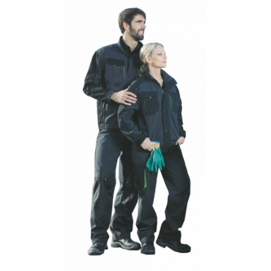 Dámské do pasu, pevný pas s poutky na opasek, přední vakové kapsy, dvojité zadní kapsy, boční multifunkční kapsa, materiál : canvas 65% polyester 35% bavlna 270g/m2. Velikost: 38 - 64. Normy: EN340. Barva: šedo-černá, zelené doplňky.