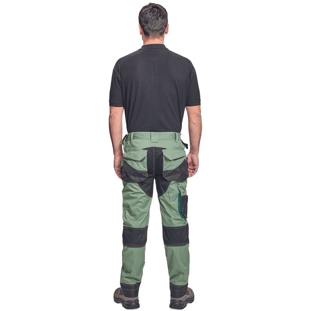 pánské pracovní kalhoty s pružným pasem; elastický inovativní materiál TRIFIBETEX®; odolné trojité prošití nohavic a sedu; Oxford 600D zesílení v oblasti kolen s možností vkládání kolenních výztuh; prostorné multifunkční přední kapsy s poutky na nářadí; reflexní prvky v barevném odstínu; nastavitelná délka nohavic.