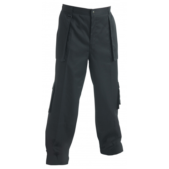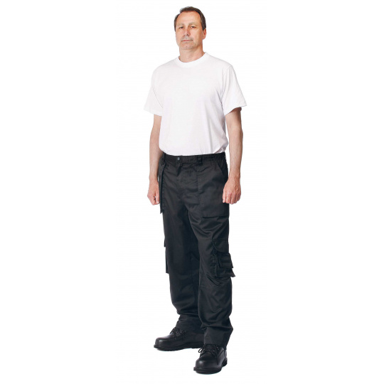Pánské montérkové kalhoty, strečová tkanina umožňující volný pohyb, pas s poutky na opasek, speciální zasouvací patent v pase proti samovolnému rozepnutí, přední kapsy s kapsou na zip, multifunkční kapsy na obou stranách, kolena zesílena 600D polyesterem