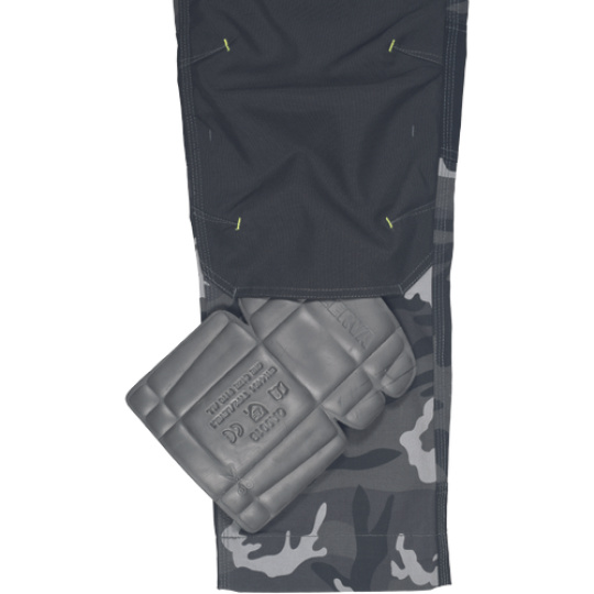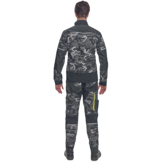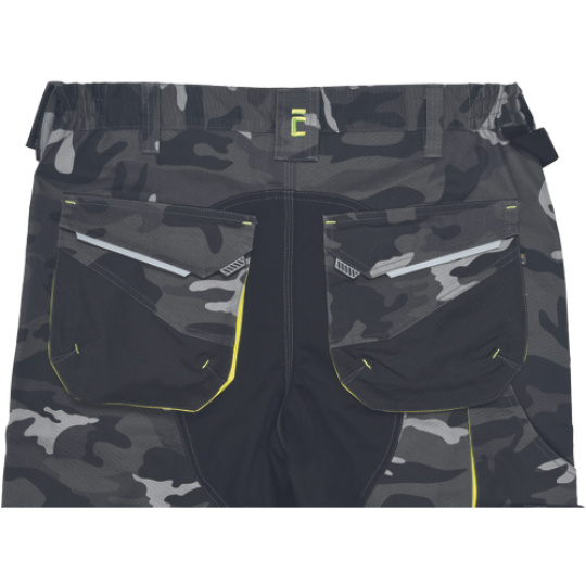 Pánské pracovní kalhoty s pružným pasem a multifunkčními kapsami; v moderní úpravě šedé kamuflážové barvy; Oxford 600D zesílení kolenních kapes pro vkládání ochranných nákoleníků; odolné trojité prošití nohavic a sedu; reflexní prvky; nastavitelná délka nohavic. Střih: relax