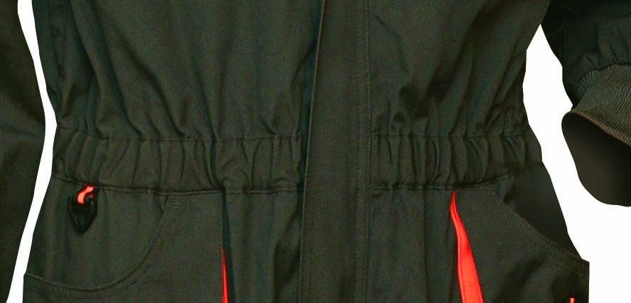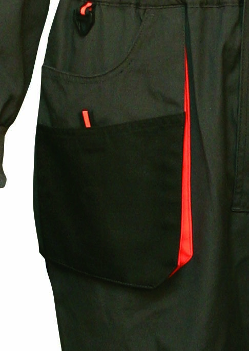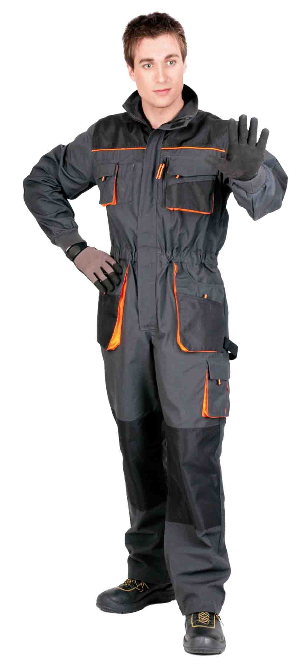 Pracovní kombinéza je vyrobená z velmi kvalitní tkaniny polyesteru a bavlny v poměru 65/35 s gramáží 280 g/ m2 a s vyztužením materiálem 600D polyester. Kromě atraktivní kombinace černé a oranžové nabízí zesílení loktů a kolen s možností vložení výztuhy kolen, všitou síťovinu pro lepší odvětrávání.