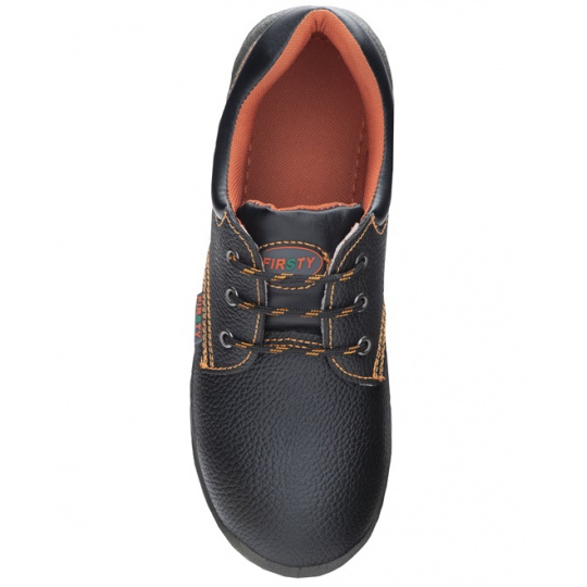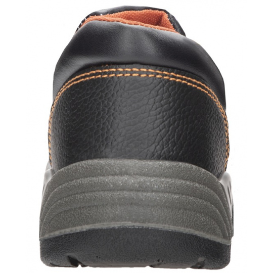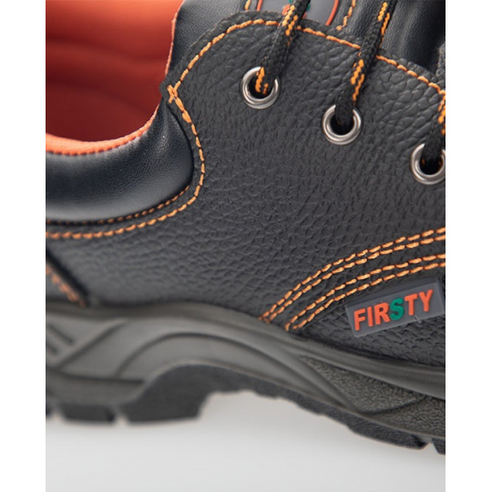 Pracovní polobotka FIRLOW 01: nízká pracovní obuv z hovězí usně bez ocelové špice, decentní akcenty v oranžové barvě, měkčená bandáž pro pohodlné nošení, PU2D nepíšící podešev, odolná olejům, pohonným hmotám a kontaktnímu teplu do 110°C, antistatická.