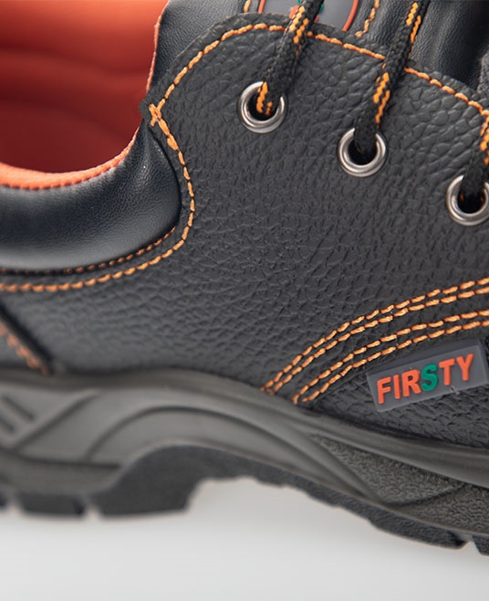 Pracovní polobotka FIRLOW 01: nízká pracovní obuv z hovězí usně bez ocelové špice, decentní akcenty v oranžové barvě, měkčená bandáž pro pohodlné nošení, PU2D nepíšící podešev, odolná olejům, pohonným hmotám a kontaktnímu teplu do 110°C, antistatická.