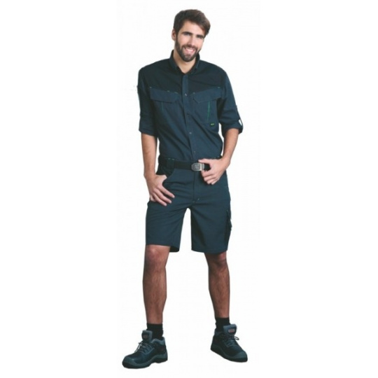 Pánské montérkové kraťasy, pas s poutky na opasek a gumou v bocích, přední klínové kapsy, multifunkční kapsy na obou stranách, dvě zadní kapsy s klopami. Doporučené použití: letní pracovní oděv, stavebnictví, strojírenství, lehký průmysl, práce na silnici, odtahové služby, automobilový průmysl, logistika, skladová manipulace, spedice, autoservisy, údržba, montáže, zemědělství, zahrada, hobby.