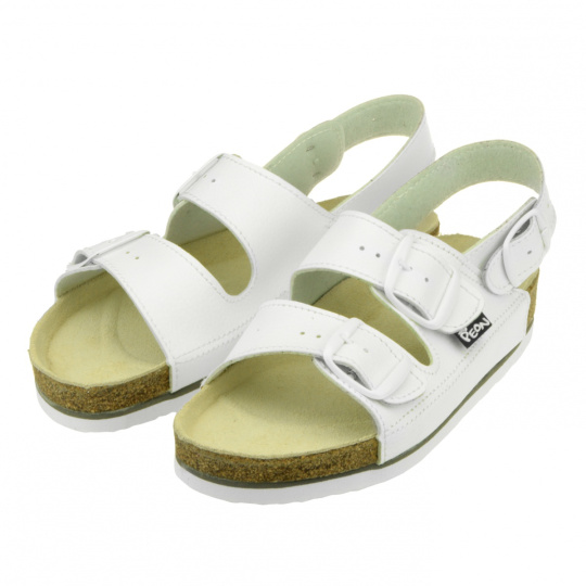 Odlehčené sandálky s korkovou mezipodešví, mechovkou tlumící otřesy, dvěma koženými pásky přes nárt a páskem s kovovými sponami přes patu umožňujícími přizpůsobení velikosti. Ortopedicky tvarované stélka potažená přírodní kůží a odlehčená podešev odolná proti uklouznutí Vám zajistí zdravé a pohodlné obutí na doma i do práce.