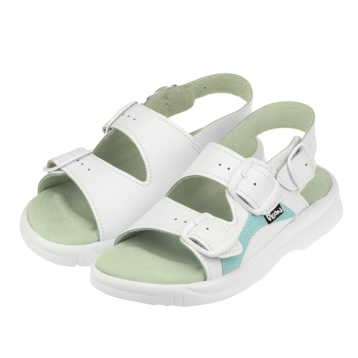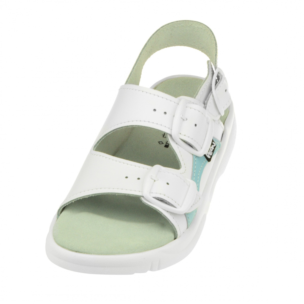 Sandály se dvěma koženými upínacími pásky přes nárt a páskem přes patu s kovovými sponami pro přizpůsobení velikosti Vám zajistí zdravé a pohodlné obutí na doma, do školy i do práce.