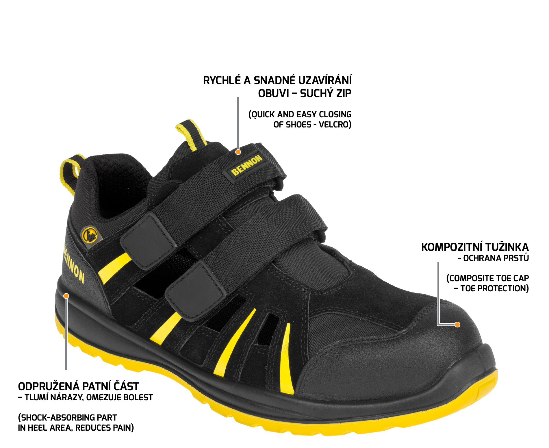 Bezpečnostní nonmetalický sandál je vyroben z kombinace štípené usně a textilie MESH. Uzavírání obuvi je rychlé a snadné, neboť je zde použit suchý zip. Nedílnou součástí této obuvi je taktéž kompozitní tužinka, která ochrání prsty na nohou v krizových situacích. Pohodlí při nošení zajišťuje odpružená pata.