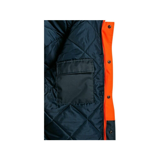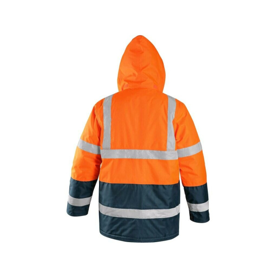 Výstražná bunda s vysokou viditelností, zateplená, odolná proti vodě a větru, kapuce v límci, reflexní pruhy, rukávy a spodní díl zakončeny tmavě modrým materiálem, 4 vnější kapsy a 1 vnitřní kapsa, venkovní kapsa na mobil, možnost utažení v dolní části bundy. Doporučené použití: stavebnictví, silničáři, řidiči, logistika, údržba, popeláři, skladníci, záchranáři, práce v zimě a mokrém prostředí.
