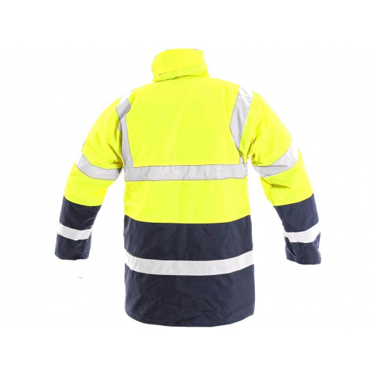 Výstražná bunda s vysokou viditelností, zateplená, odolná proti vodě a větru, kapuce v límci, reflexní pruhy, rukávy a spodní díl zakončeny tmavě modrým materiálem, 4 vnější kapsy a 1 vnitřní kapsa, venkovní kapsa na mobil, možnost utažení v dolní části bundy. Doporučené použití: stavebnictví, silničáři, řidiči, logistika, údržba, popeláři, skladníci, záchranáři, práce v zimě a mokrém prostředí.