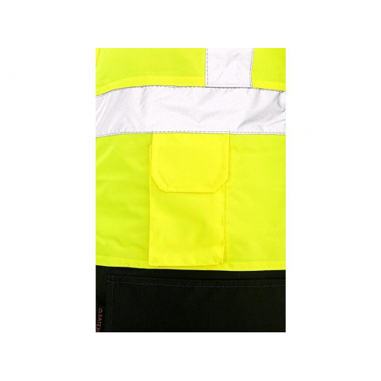 Výstražná zateplená bunda do pasu, 2v1, odolná proti vodě a větru, reflexní pruhy, lepené švy, zapínaná na zip krytý legou, odepínací rukávy s regulovatelnými a vnitřními manžetami, kapuce v límci, fleecový vnitřní límec, v délce pružný pas, 2 spodní kapsy, dvě náprsní kapsy kryté patkou na suché zipy, na levé straně poutko na přichycení ID karty, na pravé straně smyčka na radiostanici, jedna vnitřní kapsa. Uvnitř je zip pro snadnou aplikaci výšivky na vnější straně bundy.