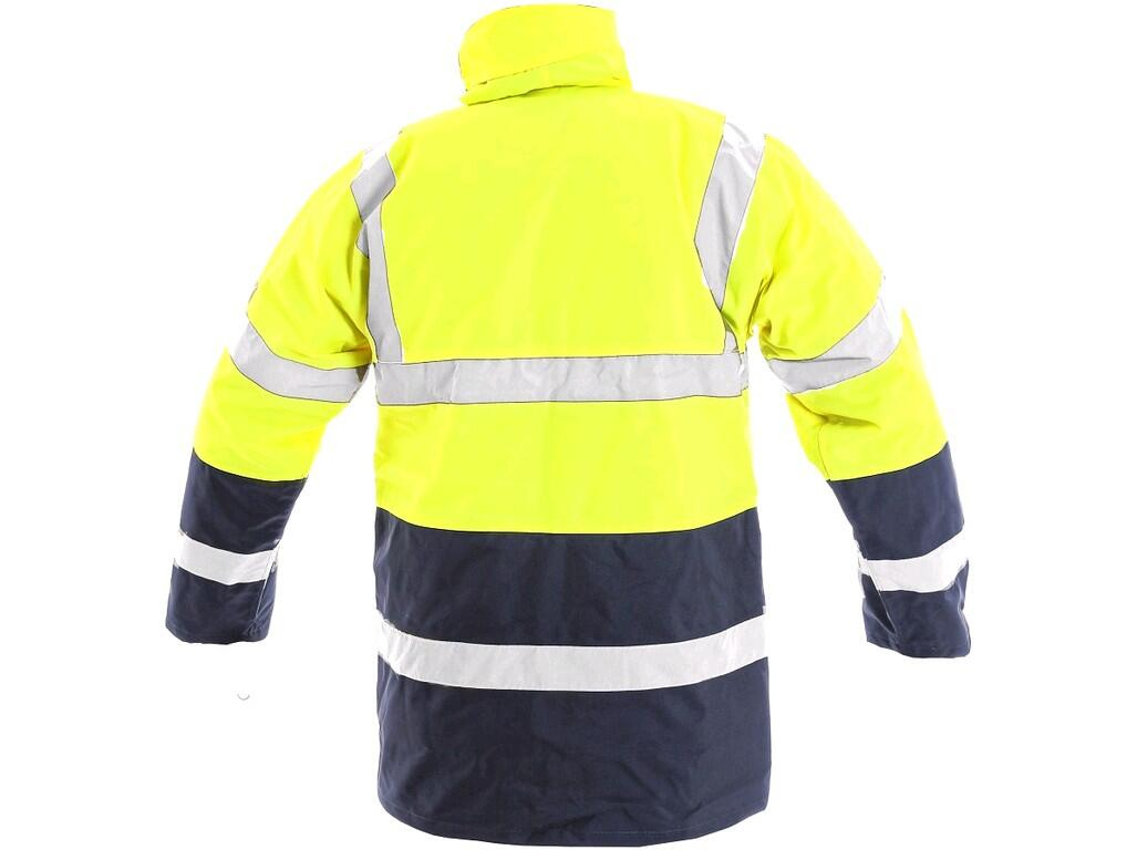 Výstražná bunda s vysokou viditelností, zateplená, odolná proti vodě a větru, kapuce v límci, reflexní pruhy, rukávy a spodní díl zakončeny tmavě modrým materiálem, 4 vnější kapsy a 1 vnitřní kapsa, venkovní kapsa na mobil, možnost utažení v dolní části bundy. Doporučené použití: stavebnictví, silničáři, řidiči, logistika, údržba, popeláři, skladníci, záchranáři, práce v zimě a mokrém prostředí.