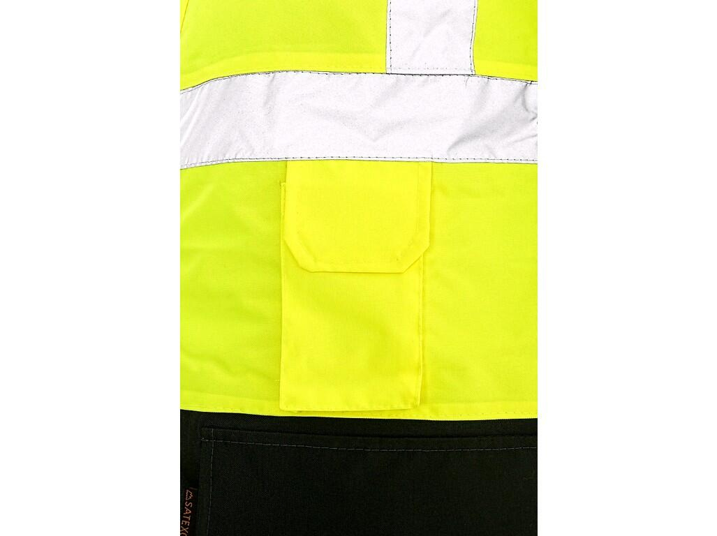 Výstražná zateplená bunda do pasu, 2v1, odolná proti vodě a větru, reflexní pruhy, lepené švy, zapínaná na zip krytý legou, odepínací rukávy s regulovatelnými a vnitřními manžetami, kapuce v límci, fleecový vnitřní límec, v délce pružný pas, 2 spodní kapsy, dvě náprsní kapsy kryté patkou na suché zipy, na levé straně poutko na přichycení ID karty, na pravé straně smyčka na radiostanici, jedna vnitřní kapsa. Uvnitř je zip pro snadnou aplikaci výšivky na vnější straně bundy.