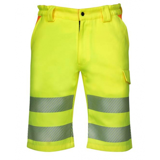 Reflexní kraťasy CXS NORWICH, žluté: Pánské výstražné kraťasy, pas s poutky na opasek a gumou v bocích, přední klínové kapsy, zadní kapsy s klopou na suchý zip, boční kapsy s klopou na suchý zip, levá boční kapsa rozdělena na dvě komory, reflexní pruhy 3M.