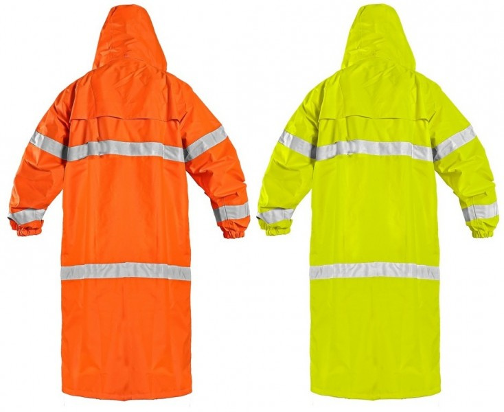 Výstražný plášť s reflexními pruhy, nepromokavý, lepené švy, odepínací kapuce v límci, zapínání na zip krytý légou, raglánové rukávy v manžetě do gumy, dvě spodní kapsy s patkou, větrání na zádech. Plášť je složen v praktickém balení na zip. Délka pláště 120 cm.