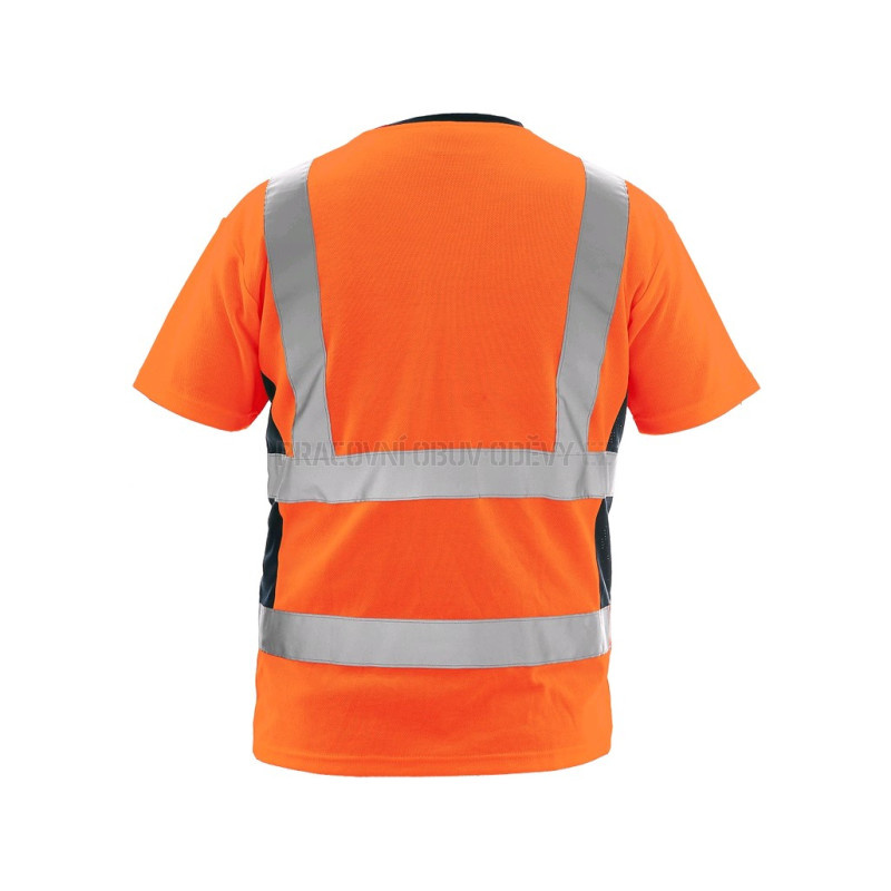 Reflexní triko EXETER oranžové: Výstražné tričko s kulatým průkrčníkem v kontrastní modré barvě, krátký rukáv, reflexní pruhy: 2 horizontální, 2 vertikální (šíře 5 cm), po stranách panely ze síťoviny v modré barvě. Doporučené použití: stavebnictví, silničáři, řidiči, logistika, údržba, kolo, motorky, skladování.