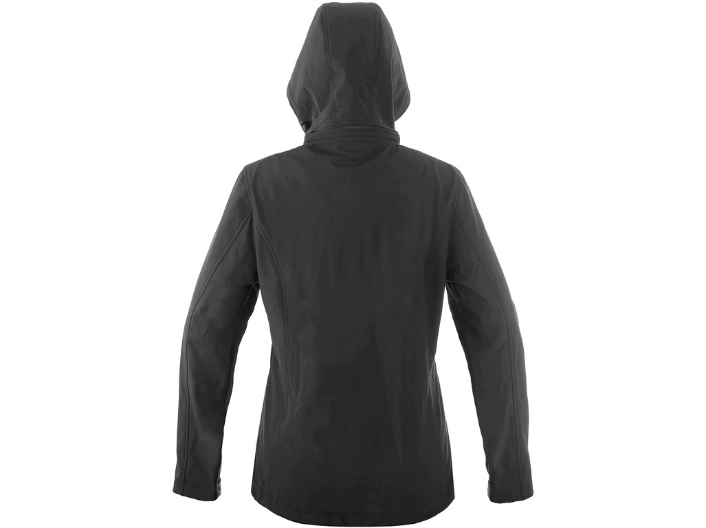Dámská softshellová bunda s odepínací kapucí, odolná proti vodě a větru, zapínaní na zip, větrání v podpaží, náprsní kapsa na zip, boční kapsy na zip, rukávy s vnitřními manžetami, stahování v dolním okraji, reflexní doplňky, TPU membrána. Odolnost materiálu proti průniku vody 5 000 mm mimo oblast švů, paropropustnost 5 000 g/m2/24h.