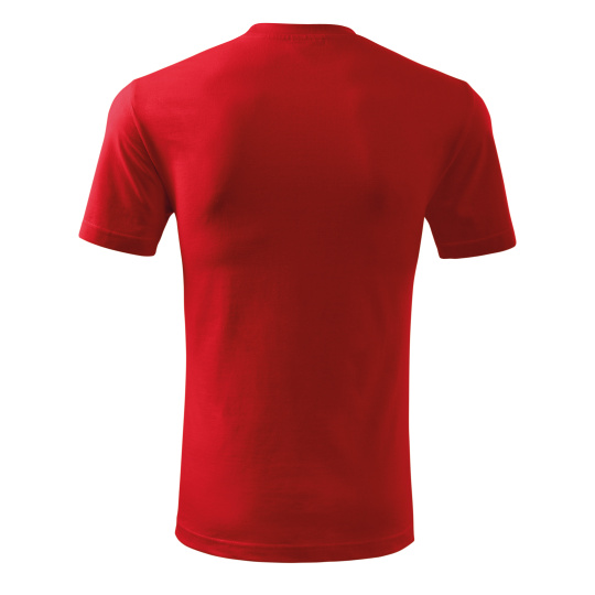 Tričko s krátkým rukávem, kulatý průkrčník se zdvojenými švy. Na rukávech a spodním lemu jsou použity švy v červené barvě. Zpevňující krční páska také v červené barvě. Tričko je označeno logem naší obchodní značky na rukávu a v bočním švu všitým štítkem. Látka je celoplošně potištěna s finální silikonovou úpravou materiálu, která zajišťuje vyšší měkkost a pružnost, rozměrovou stálost a omezuje žmolkovatění.