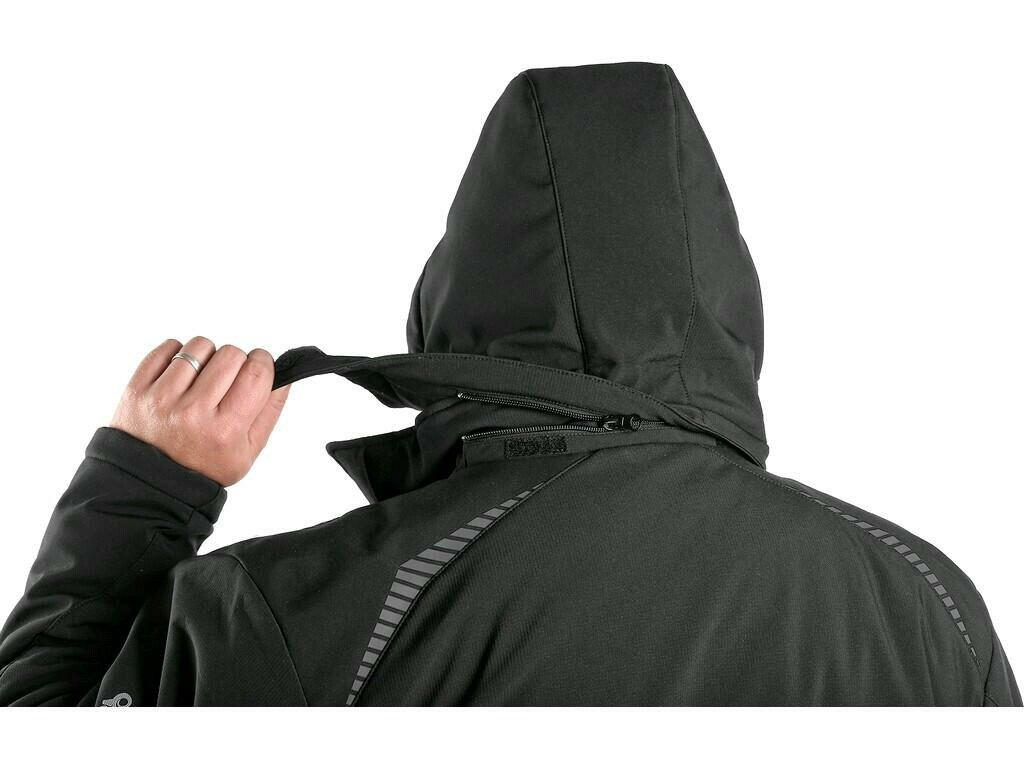 Pánská zateplená softshellová bunda s odepínací kapucí, odolná proti vodě a větru, zapínaní na zip, větrání v podpaží, náprsní kapsy na zip, v pravé kapse odnímatelné pouzdro na ID kartu, boční kapsy na zip, vnitřní kapsy, vnitřní manžety v rukávech, stahování v dolním okraji, reflexní doplňky, TPU membrána, vnitřní otvor na zip pro aplikaci výšivky. Odolnost materiálu proti průniku vody 8 000 mm mimo oblast švů, paropropustnost 3 000 g/m2/24h.